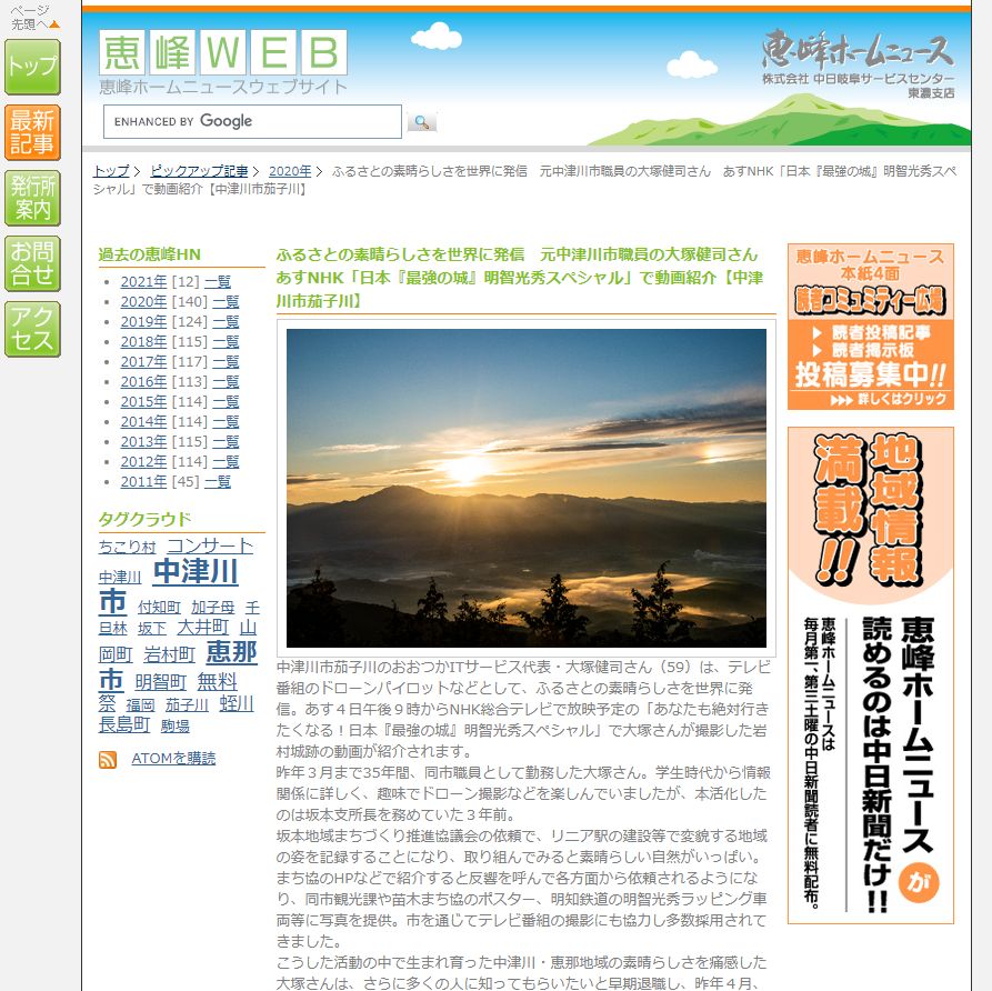 ■雑記帳 ヘッダ表示 恵峰ホームニュースで紹介していただきました! 2020.01.03 2021.01.23 Post Share Hatena Line RSS feedly Pin it note 記事のタイトルとURLをコピーする 中津川・恵那地域および木曽地域に配布される「恵峰ホームニュース」で、私の活動を紹介していただきました。 編集長の朝日さんは、以前から大変お世話になっている方で、私の話を聞いて上手にまとめてくださいました。 これを励みに、この活動を続けていきたいです! http://www.keiho-news.com/keiho_hn/2020/kasagiyama/ オーストラリアのABCで僕の映像を使っていただきました 前の記事 恵那中央出張所のPR動画のお手伝いをしました 次の記事